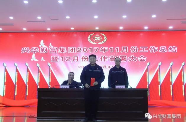 2017年12月7日晚18:30,兴华财富集团召开11月份工作总结暨12月份工作部署大会。集团公司董事长陈茂春、副总裁付新岗、李福忠、董事长助理高振伟、王法清出席会议。集团公司各一级、二级、三级公司负责人及班长以上管理干部、工程技术人员共计400余人参加大会。