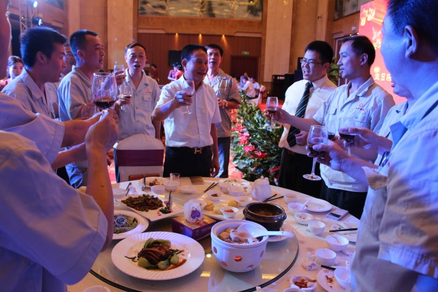 宴会现场的大家纷纷给董事长献花敬酒,把酒尽欢,并合影留念!
